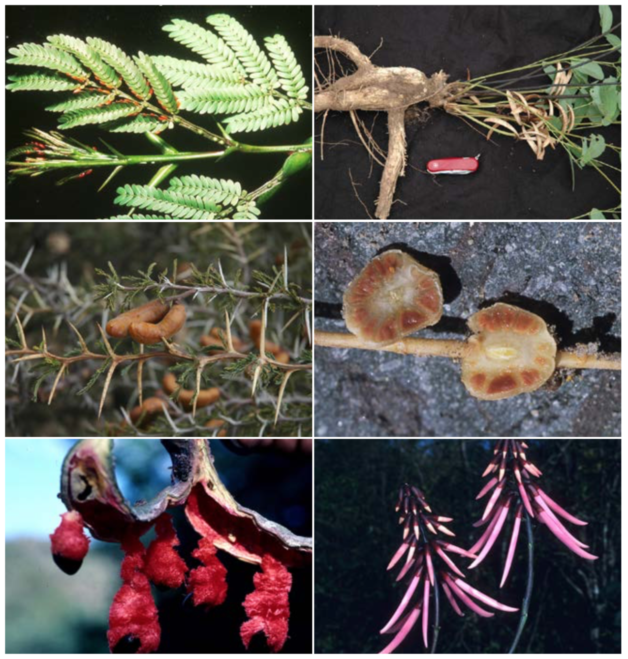 Exemplar Legume Functional Traits. Clockwise from top left: ant associations involving extrafloral nectaries, domatia and beltian bodies, Vachellia cornigera; growth forms: a fire-adapted geoxyle with an underground lignotuber, Calliandra longipes; armature: Prosopis ferox; nodulation: nodules of Lupinus nubigenus; seed dispersal syndromes: fleshy arils of Pithecellobium lanceolatum; pollination syndromes: humming bird pollinated flowers of Erythrina lanata. All photos Colin Hughes.