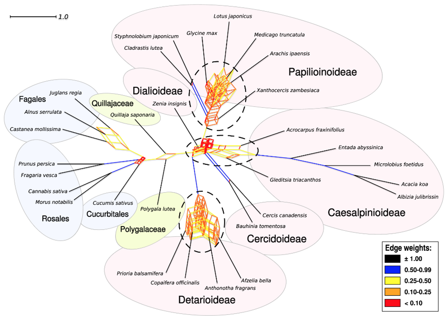 Figure 3 from Koenen et al. (2020b). Filtered supernetwork of the legumes showing tangles of gene tree relationships at the bases of the legumes, and sub-families Detarioideae and Papilionoideae, that correspond to WGDs, as well as possible reticulation at the base of Caesalpinioideae.