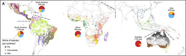 Finally, Jens Ringelberg, Erik Koenen (University of Brussels, Belgium), and Colin Hughes (University of Zurich, Switzerland) and colleagues published a study on the drivers of turnover across space and time in the pantropical Mimosoid clade (Caesalpinioideae). This clade contains circa 3,500 species in 100 genera and occurs across the tropics, and Jens et al. assembled an occurrence dataset of over 424,000 occurrence points, covering all genera and 93% of Mimosoid species. Various analyses, such as ancestral niche reconstruction and phylogenetic regionalisation (see figure), show that water availability across the tropics is the main driver of taxonomic and phylogenetic turnover.