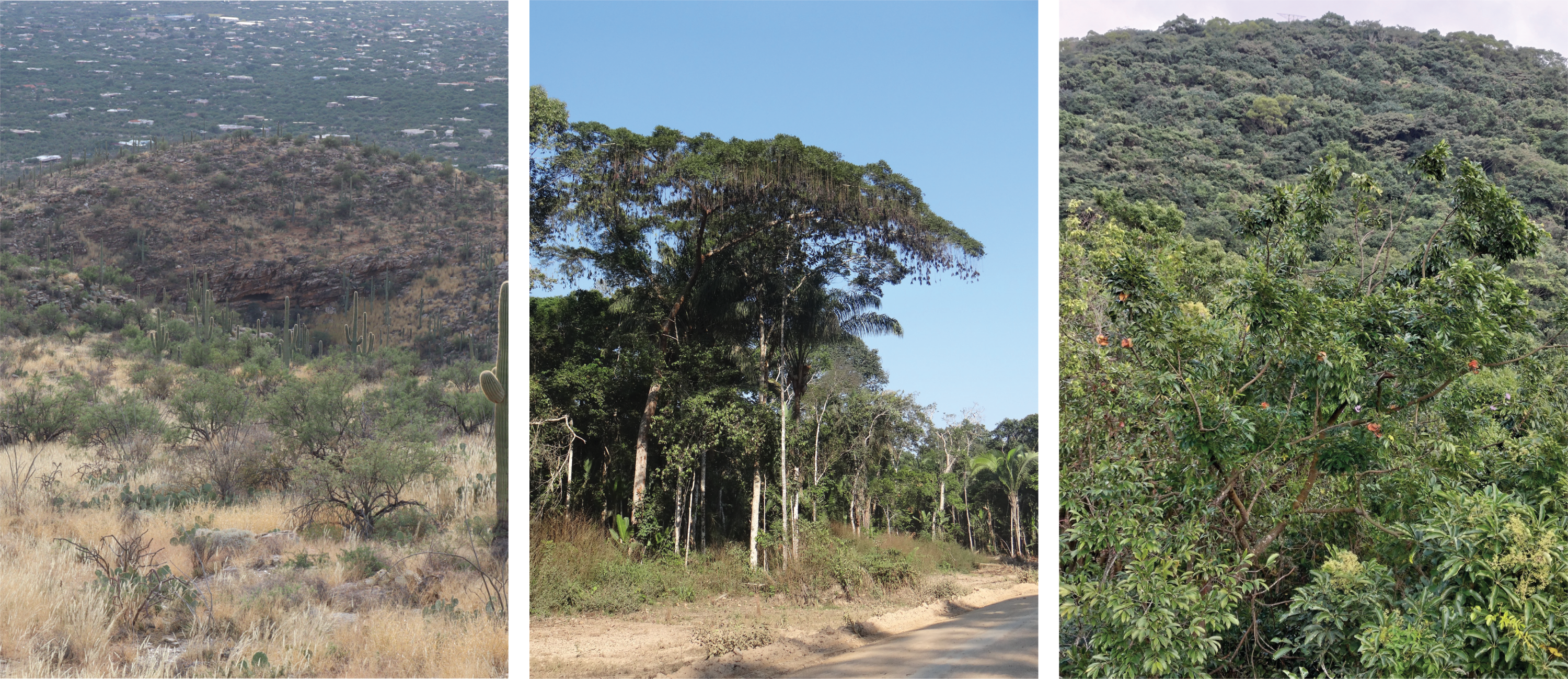 Left to right: Different rainfall regimes of Neltuma velutina and Vachellia constricta (dry) in the United States, Parkia pendula (intermediate) in Bolivia, and Archidendron lucidum (wet) in Taiwan. Photographers: L.E. Becklund; V.A. Vos (iNaturalist); mira_hlt (iNaturalist).