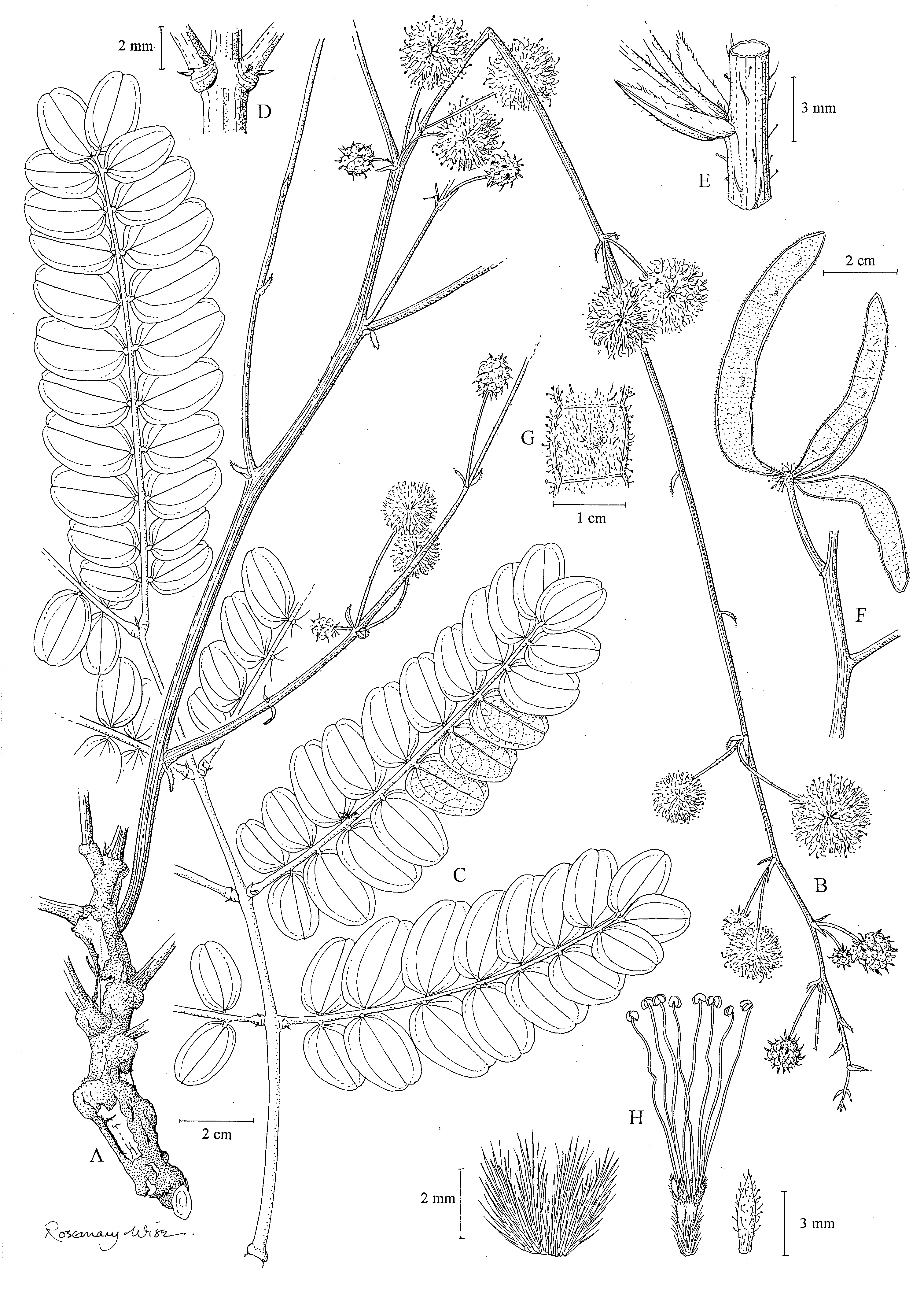 Mimosa suberosa, a Bolivian endemic. Copyright: Rosemary Wise. Published in Atahuachi & Hughes 2006. Two new species of Mimosa (Fabaceae) endemic to Bolivia. Brittonia 58(1): 59–65.