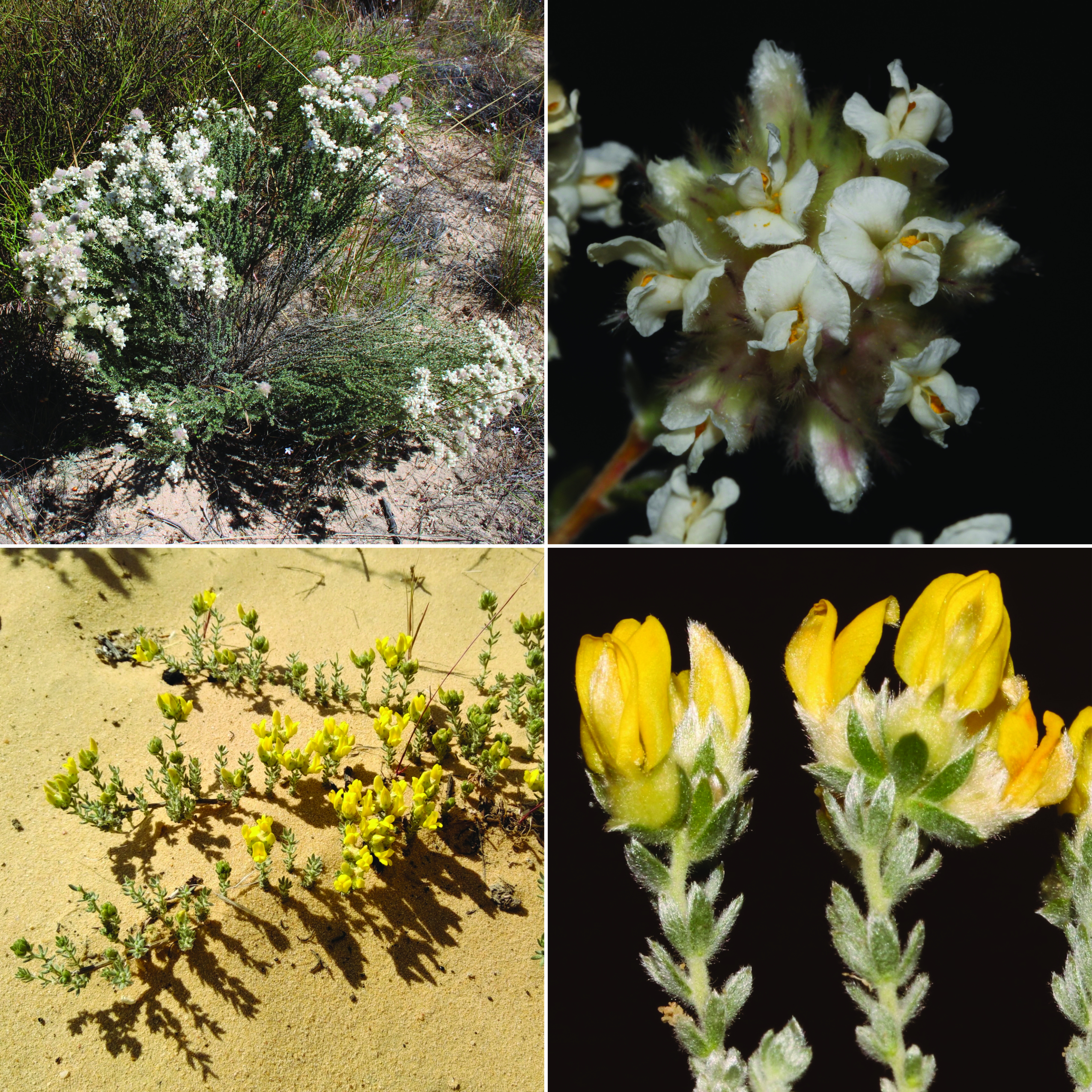 Clockwise from top left: Grievea craigiana; photo by Gillian Craig, Jennata empetrifolia; photo by Murray Fagg, Loricobbia pauciflora; photo by Terry Macfarlane.