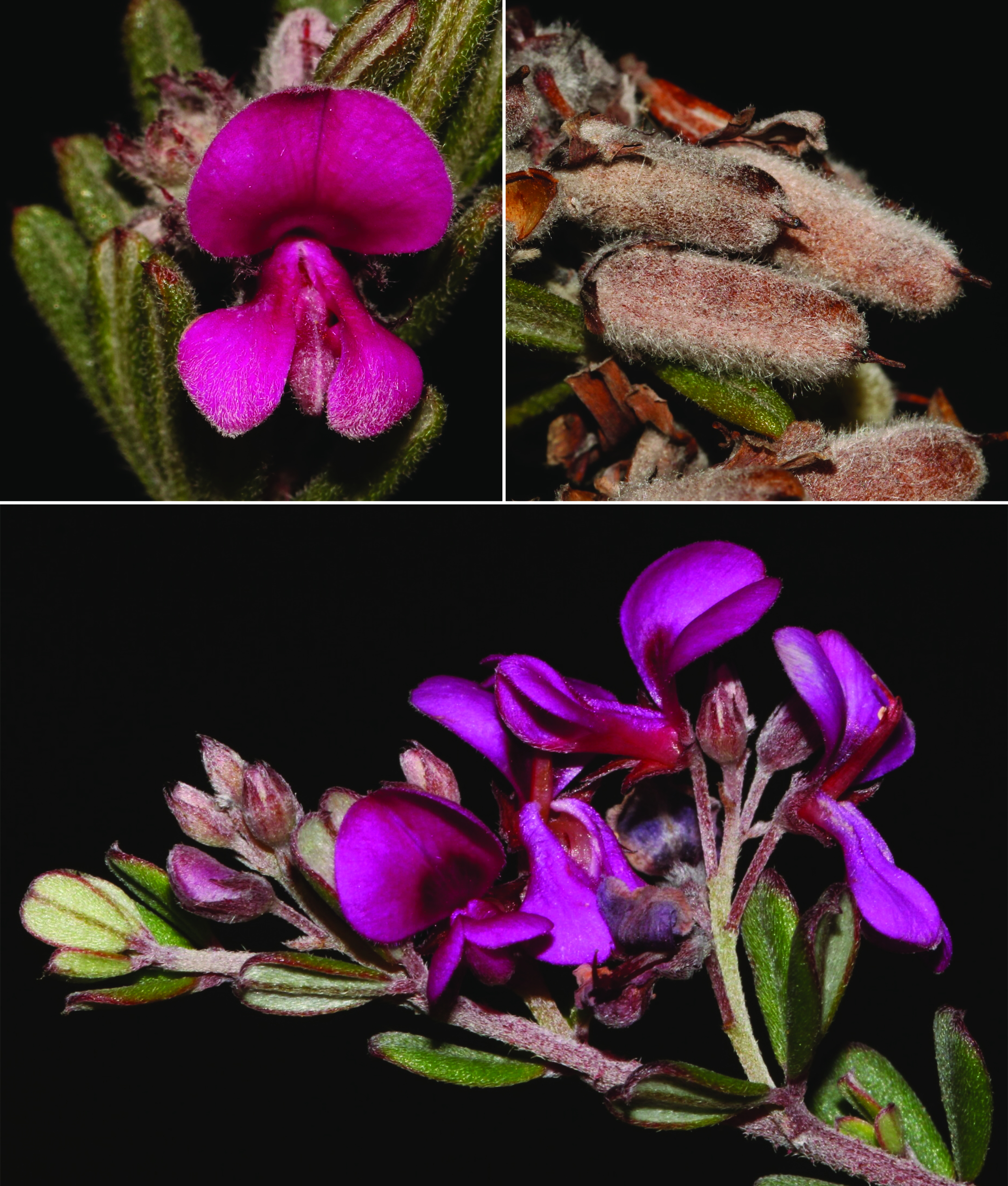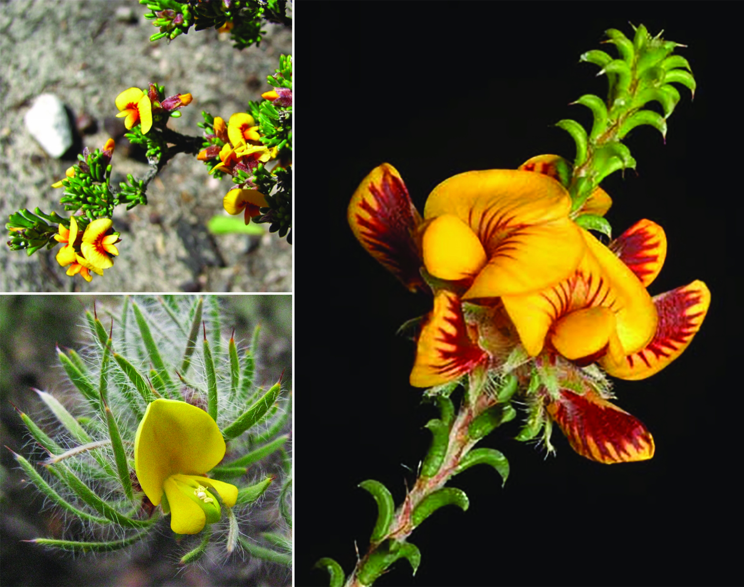 This study presents a landmark example of how detailed morphological and geographical data are providing evidence for the delimitation of sets of morphologically distinct, narrowly endemic species across physiographically and geologically diverse and complex landscapes from previously widespread polymorphic species complexes. Here, detailed morphological analysis of the Pultenaea setulosa species complex, sampling more densely than previously across the Great Dividing Range and the Blue Mountains of SE Australia, has shown that geographically discrete populations are morphologically distinct and uniform, exhibiting fixed character states, suggesting strong geographical/ecological isolation over short distances. Alongside preliminary genetic data indicating non-monophyly of the elements of the P. setulosa complex, this study provided the basis for delimiting 18 species, 14 of which are described as new. These include several species illustrated below, which are named for legume specialists: P. westonii, named for Peter Weston, P. corrickiae, named for Margaret Corrick, and P. woolcockiorum, named for Dorothy and Collin Woolcock, who authored a popular book on native peas in SE Australia.