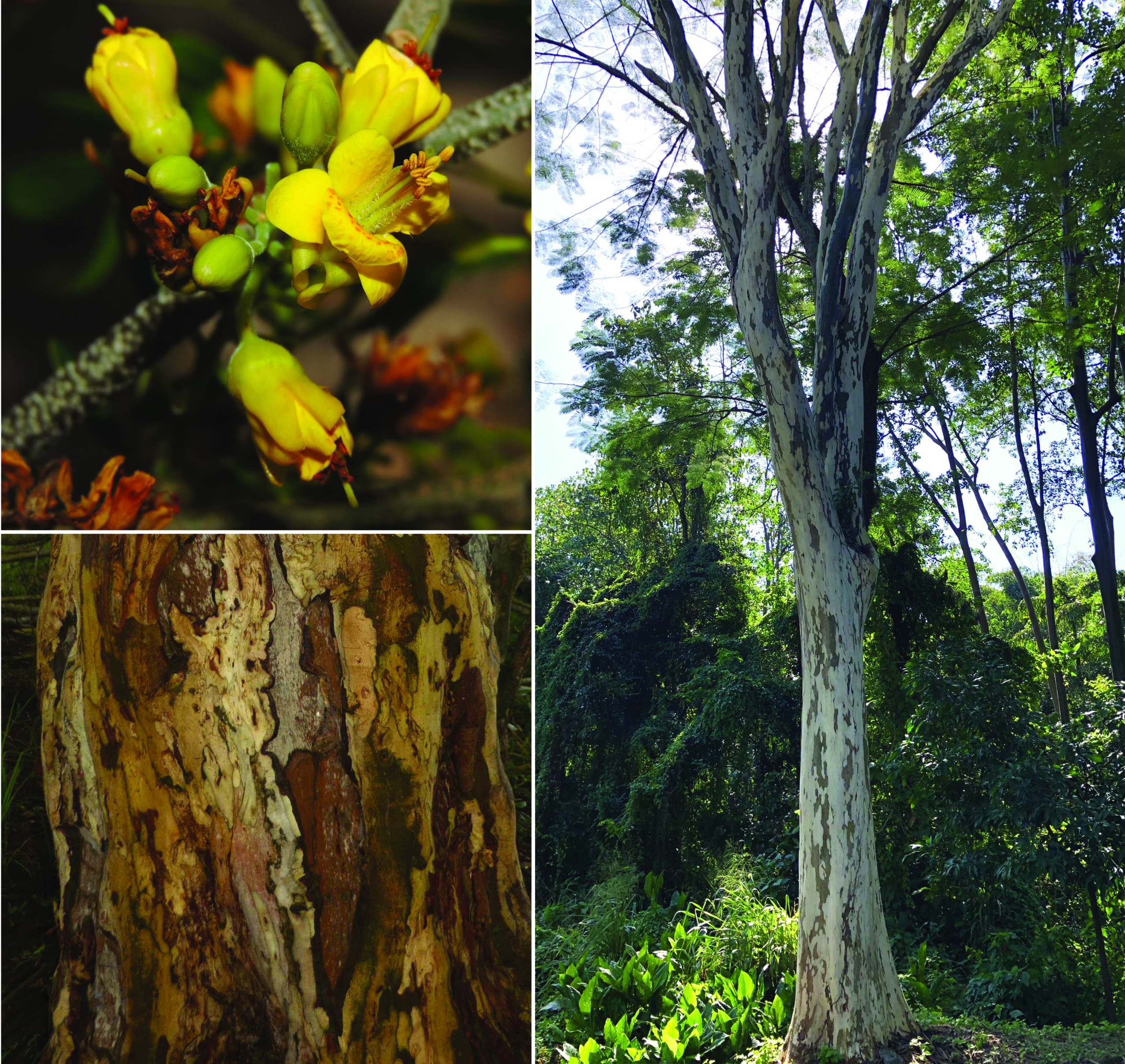 Clockwise from top left: Flowers of Libidibia juca; photos by R. Queiroz, tree habit of L. leiostachya; photo by J. Moreno, snake-bark of L. parvifolia; photo by L. Queiroz.