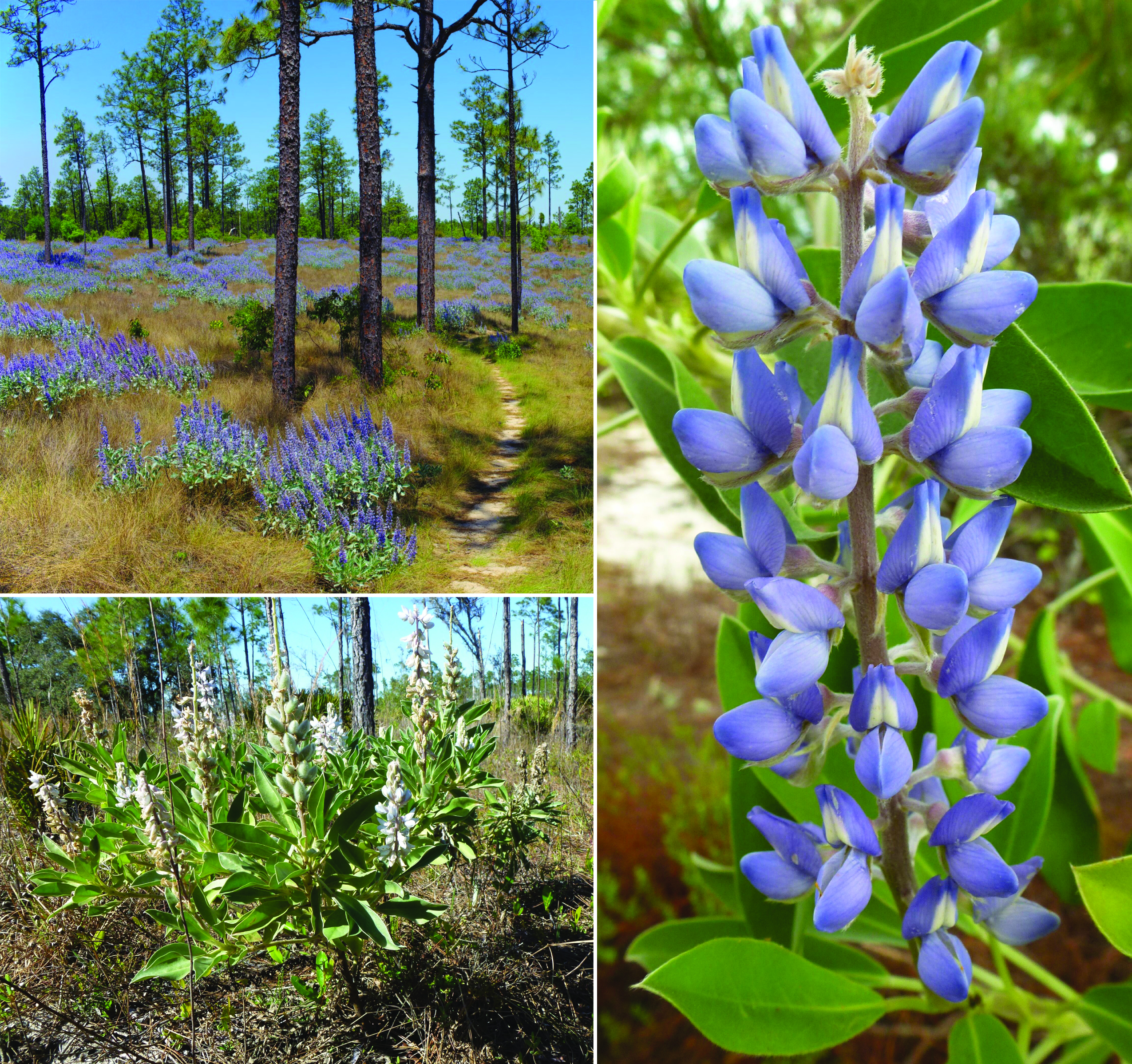 Lupinus westianus in the pine barrens of the Florida panhandle (top left) and Lupinus floridanus (bottom left and right); photos Floyd Griffiths (top left); Edwin Bridges (bottom left and right).