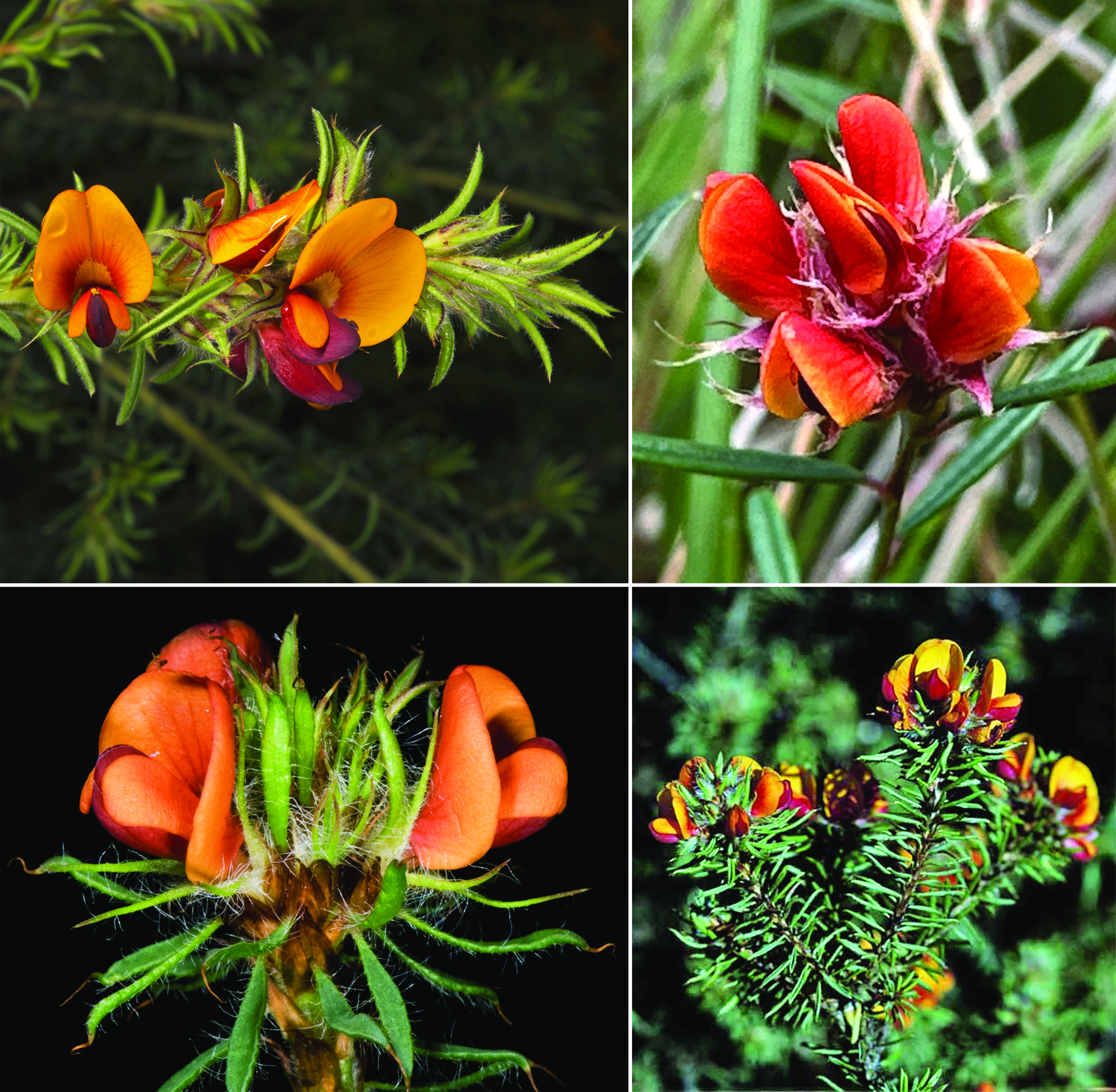 Top from the left: Pultenaea corrickiae, photo by Andrew Orme; P. rubescens, photo by Paul Rossington. Bottom from the left: P. westonii, photo by Andrew Orme; P. woolcockiorum, photo by Murray Fagg.