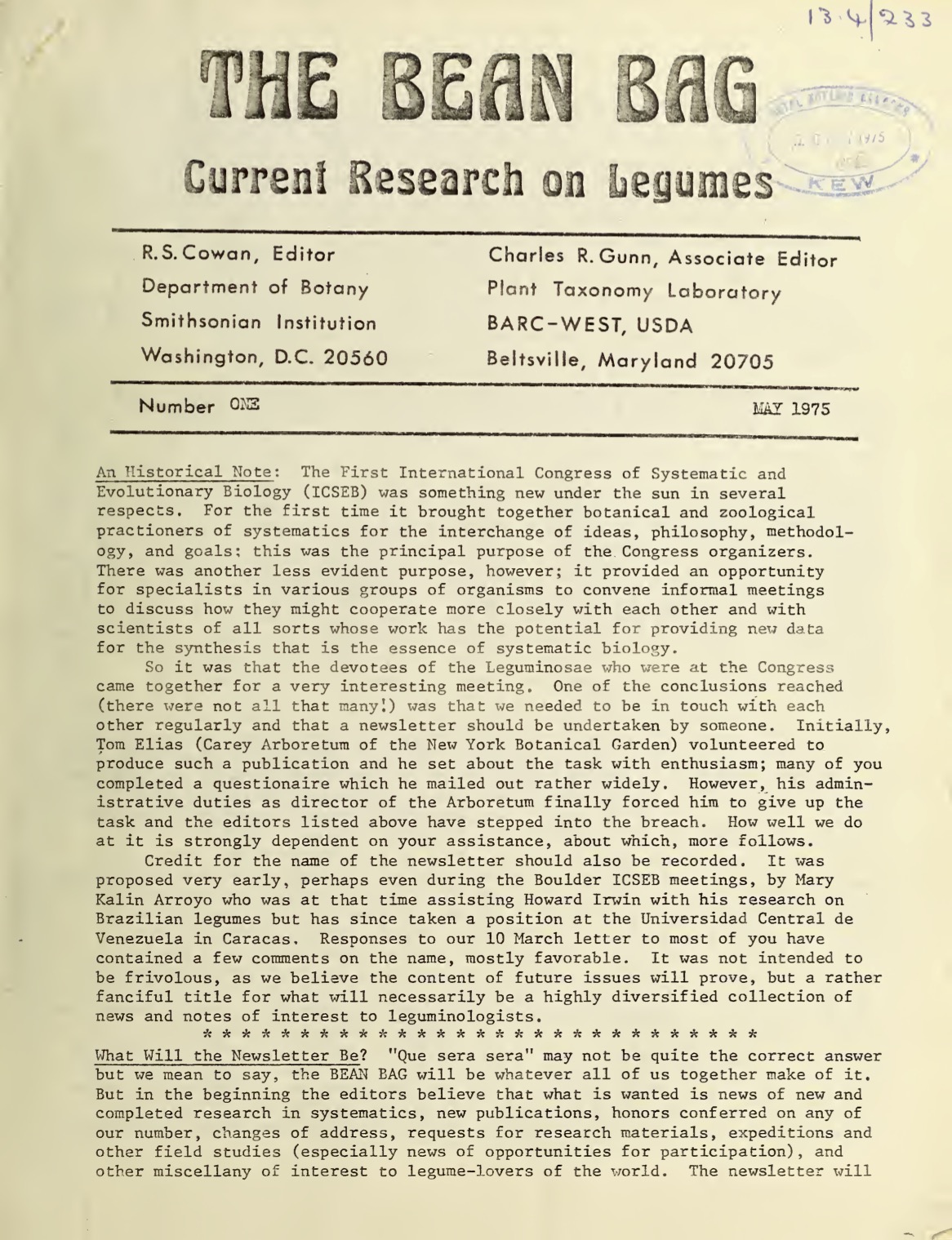 The origin of the newsletter goes back to an informal meeting betwen legume systematists attending the First International Congress of Systematics and Evolutionary Biology (ICSEB), held in 1973 at the University of Colorado, US. Two years later, in May 1975, the first printed issue, edited by Charles (Bob) Gunn and Richard Cowan, and distributed around the world.