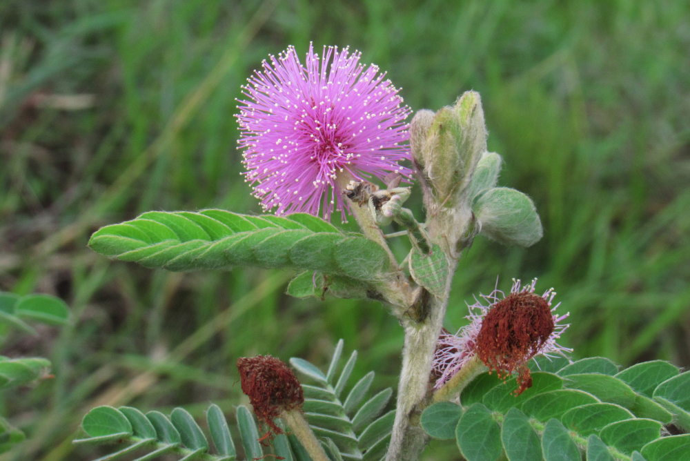 A praying mantis embushes a bee visiting the inflorescence of Mimosa bombycina Barneby in Serra do Cipó, Minas Gerais, Brazil. Photo by Monique Maianne.